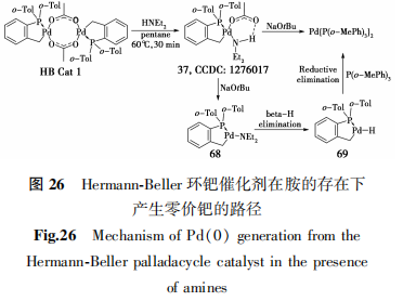 尽管Hermann-Beller环钯催化剂在有机合成中得到了广泛的应用,并且该催化剂是一个结构明确的配合物,它的催化机理一直存在争论。1996年,Hartwig课题组通过实验验证了从Hermann-Beller环钯催化剂产生零价钯的途径[20],首先Hermann-Beller环钯催化剂和二乙基胺反应发生解离生成单体钯物种,其结构得到了单晶的证实。该单体钯催化剂在叔丁醇钠的作用下生成胺基钯物种,后经历β-H消除和还原消除生成零价钯物种。Hermann-Beller环钯催化剂、单体钯催化剂和零价钯催化剂在钯催化的4-溴苯乙酮和N-甲基苯胺的胺化反应中表现出类似的催化活性,从而证实了上述零价钯的产生路径(图26)。2005年,Jutand等[36]以DMF为溶剂通过电化学手段检测到了零价钯的生成。但是,Hermann等[5]以及后来的Shaw[37]都发现环钯物种的核心环状结构在反应过程中不被破坏,因此Pd(II)/Pd(IV)催化过程被提出用于解释Heck反应的机理。