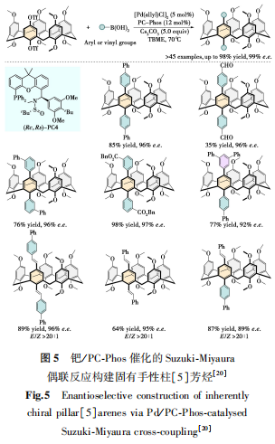 柱[n]芳烃在生物医学、材料科学和超分子凝胶等领域应用广泛,其中光学纯柱芳烃在手性识别、传感和不对称催化等领域具有重要价值。传统获取手性柱[n]芳烃的方法依赖拆分剂或手性 HPLC 拆分,通过不对称催化合成此类化合物仍面临挑战。2025年,青岛大学Liu等[20]利用钯催化剂和 Sadphos 配体,首次开发了一种不对称延伸边臂 Suzuki-Miyaura 交叉偶联策略,模块化构建了固有手性柱[5]芳烃,避免了传统拆分步骤,产率和选择性显著优于现有方法(图5)。反应核心是通过迭代延伸非手性柱[5]芳烃的取代基,利用边臂空间位阻限制旋转诱导产生固有手性。机理研究表明,第1步Suzuki偶联产物快速外消旋,手性控制主要发生在第2步Suzuki偶联。PC4配体的大位阻柔性边臂与钯中心的空间位阻和电子作用是立体控制的关键。